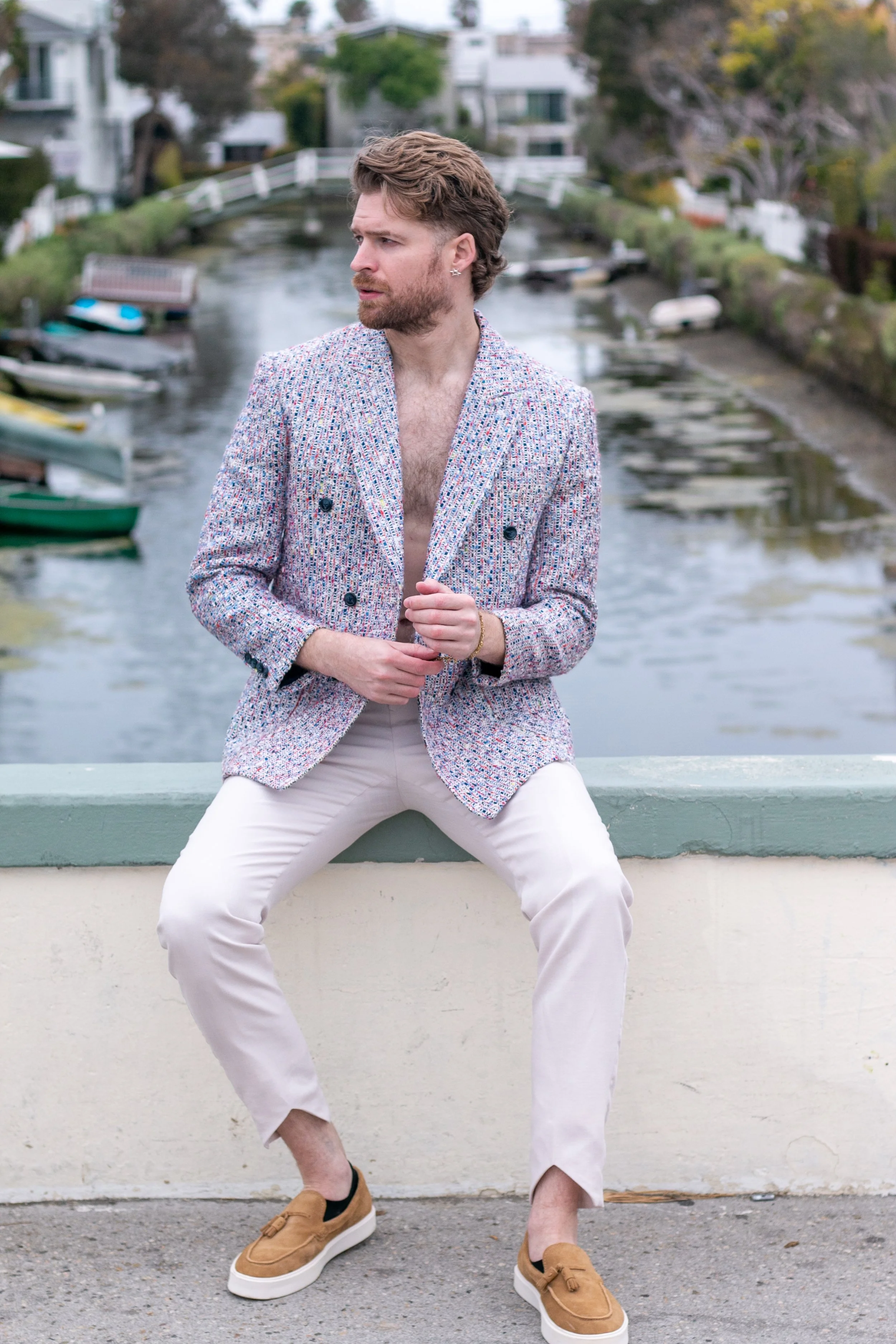 As for why he’s not wearing a shirt underneath — honestly, we just didn’t think of it. With a double-breasted blazer, once it's buttoned up, you could argue an undershirt isn’t necessary (though this isn’t a styling tip).